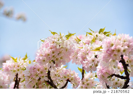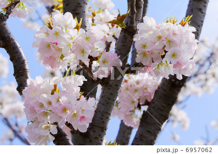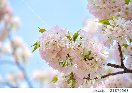 薄ピンクの花びらの苔清水という名の桜の樹の枝と葉のある風景