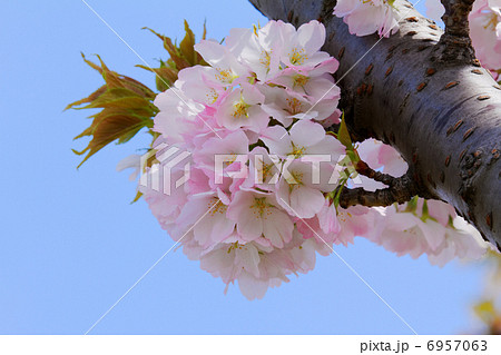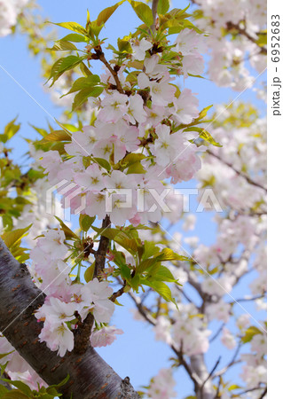 青空を背景として、苔清水と推定されるサクラの樹の枝の花をローアングルで撮影した写真
