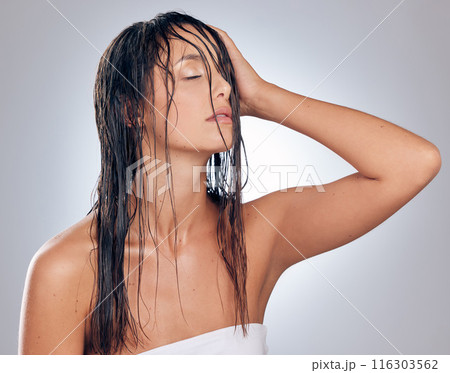 Thinking, woman and wet hair in studio for shampoo, hygiene and idea for keratin treatment. Hand, model girl and cosmetics for cleaning, shower and grooming for morning routine by white background