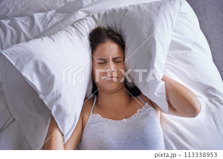 Bed, insomnia and woman frustrated with sleeping with anxiety, restless and unhappy on soft mattress. Apartment, home and female person depressed with mental health in bedroom of house at night