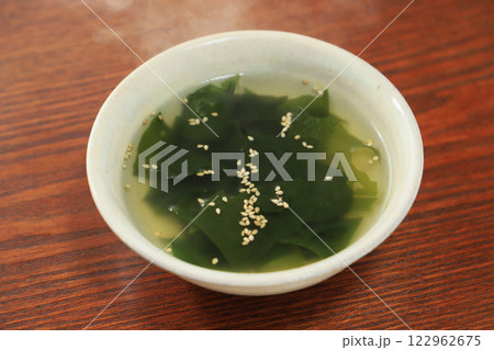 素朴な味わいを楽しむ。シンプル、わかめスープ(湯気あり)