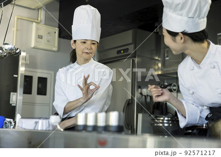 レストラン厨房で若手に指示を出すベテラン女性シェフ
