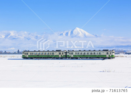 磐梯山と雪原を走る只見線の列車 福島県会津美里町