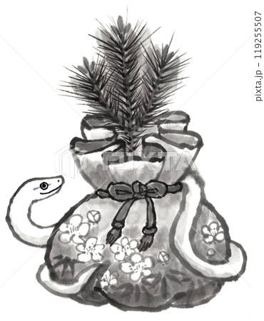 松、南天、千両、椿つき正月しめ縄輪飾りの水彩イラスト
