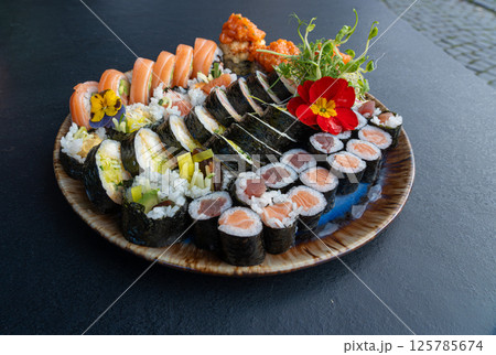 Colorful Japanese Sushi Platter with Variety of Rolls and Edible Flowers