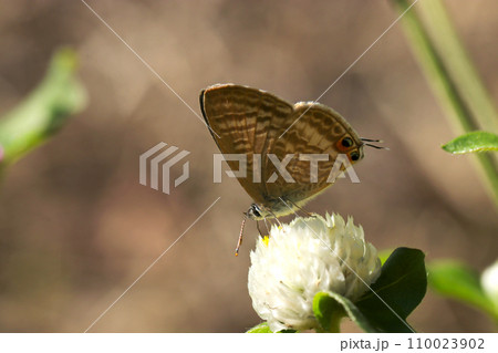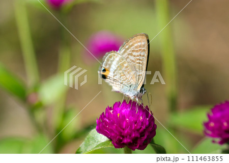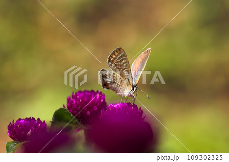ウラナミシジミ蝶が紫色のセンニチコウノ花から吸蜜(自然光+マクロ撮影)