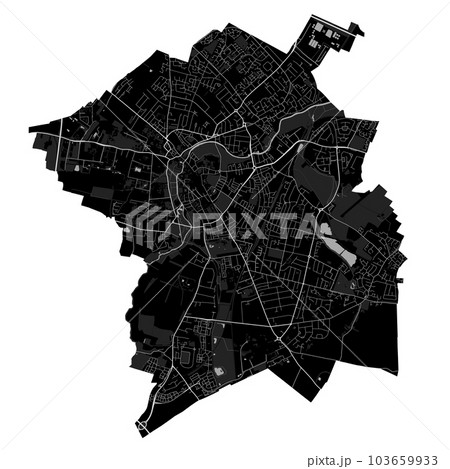 Cambridge city black map, England, the United Kingdom. Detailed administrative map with roads and railways, parks and and rivers.