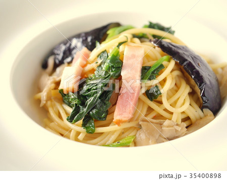 茄子ときのこの和風パスタ (横位置ハイアングル)