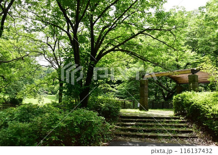 横浜市都筑区 茅ヶ崎公園の緑道散策路と休憩所と新緑
