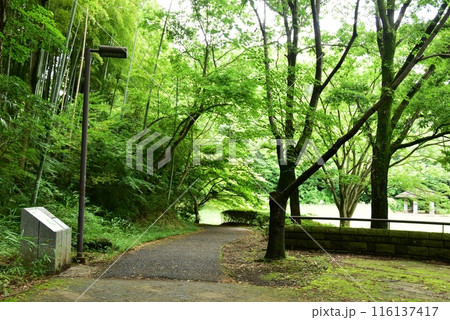 横浜市都筑区 茅ヶ崎公園の緑道散策路と新緑