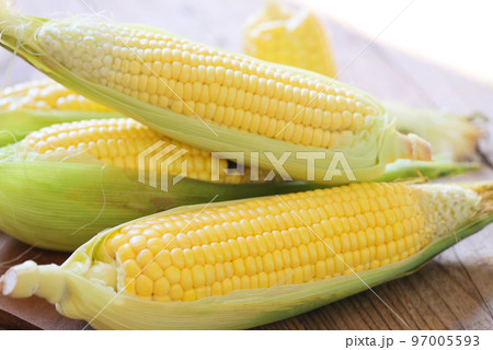 Fresh cor on cob on wooden background, Harvest ripe corn organic, Sweet corn for cooking food