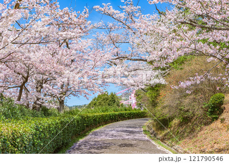 春の茨城県つくば市のつくば霞ヶ浦りんりんロードの満開の桜並木と筑波山