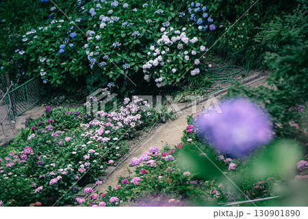 あじさいの杜 満開のピンク色のアジサイの花が咲く風景(アップ)