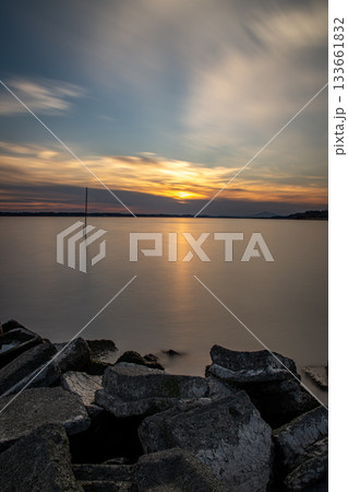 涸沼湖に沈む夕日と静かな湖面の長時間露光風景