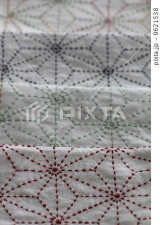 カラフルな刺し子の布巾 麻の葉模様の刺し子