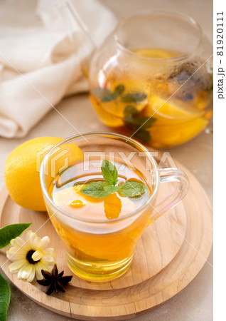 Delicious fruit tea with mint, herbs, lemons and orange slices. Glass teacup and glass cup of tea.