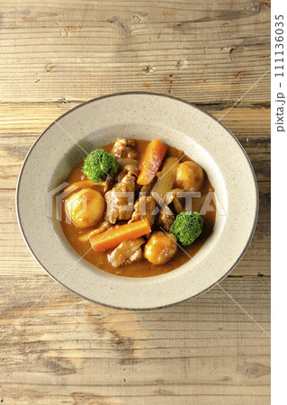 ブロッコリーや人参、しめじなど沢山の具材が入っているビーフシチューを俯瞰で撮影