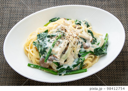ほうれん草ときのこのクリームパスタ。(白バック)