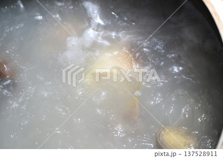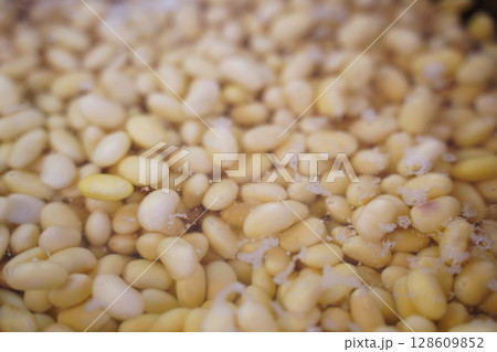 湯気の立つスープ - 大鍋の中の大豆の茹で汁 - 手作り味噌の工程写真(大豆を茹でる)・呉汁