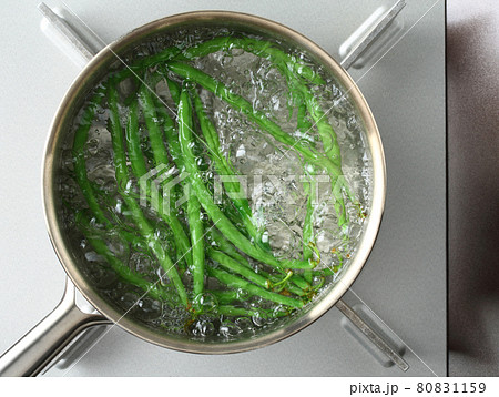 さやいんげんを茹でる調理工程 俯瞰撮影