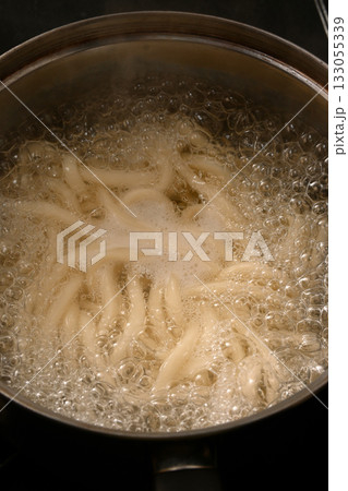生パスタ(フェットチーネ)をたっぷりの湯で茹でている1