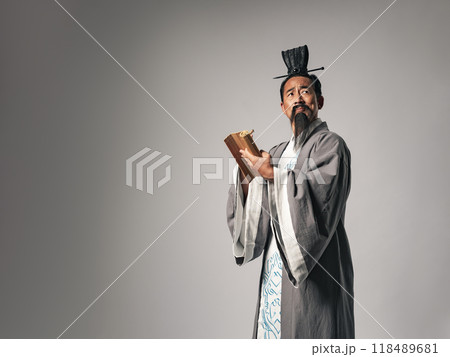 三国志に登場する諸葛孔明のような中国歴史上の人物が竹簡を持って考えるシーン