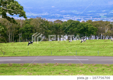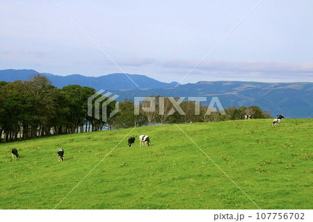 浅間牧場で草を食むホルスタインと夏の牧草地(群馬県)