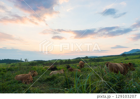 夕暮れの高原と牛(大分県竹田市久住高原)
