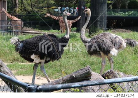 動物園で向かい合うダチョウとキリンのいる風景写真素材