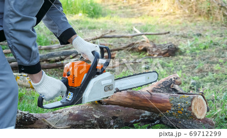 Close-up of sawing a dry log with a chainsaw
