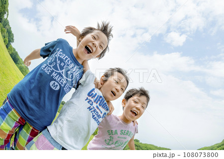 公園の丘を手をつないで駆け上がる小学生たちの後ろ姿