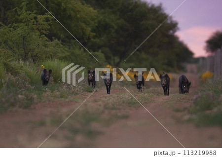 Wild boar herd in a water hole, Chaco Forest, La Pampa province, Patagonia, Argentina.