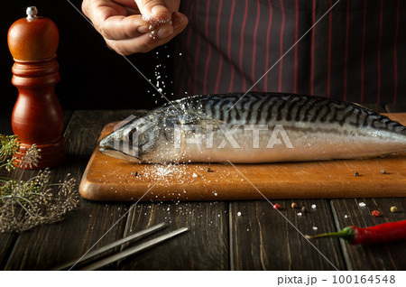 The chef is salting Scomber in the kitchen. Cooking fish according to a special recipe for a restaurant