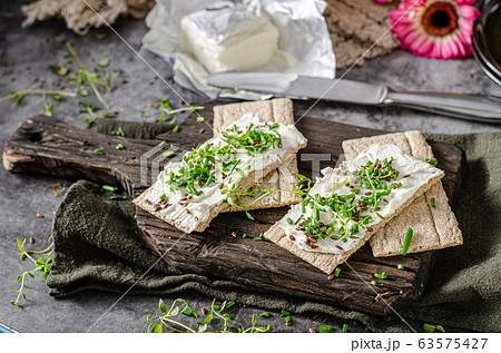 Delicious fresh cheese with herbs on crispbread