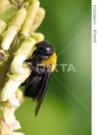 クサエンジュの花蜜を吸うメスのキムネクマバチ(自然光+マクロ接写写真)