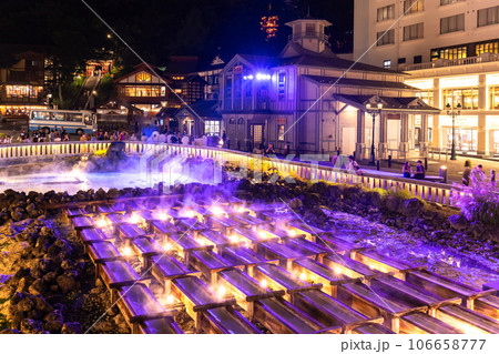 群馬県 草津温泉の湯畑 夜景ライトアップ