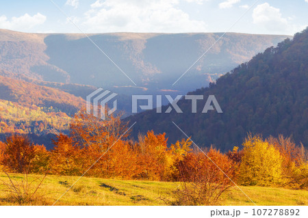 trees in colorful foliage on the grassy hill. beautiful autumn landscape in mountains on a sunny day. carpathian countryside in fall season