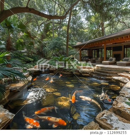 AI-generated content. Tranquil koi pond with a surrounding sitting area and lush landscaping
