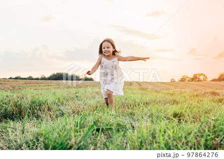 Smiling little girl joyfully running across field. Happy carefree child on grassy meadow. Outdoor walking.