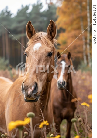 Horses grazing in a field with plenty of copy space for text, vertical composition
