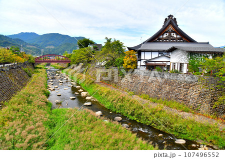 城下町の古い町並み お寺の塀と荒城川沿いの遊歩道から見た赤い今宮橋