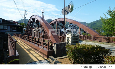 飛騨古川の荒城川に架かる朱塗りの橋と飛騨の山々