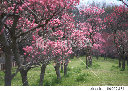 早春の梅林の中のピンク色の梅の花 大阪府堺市の荒山公園