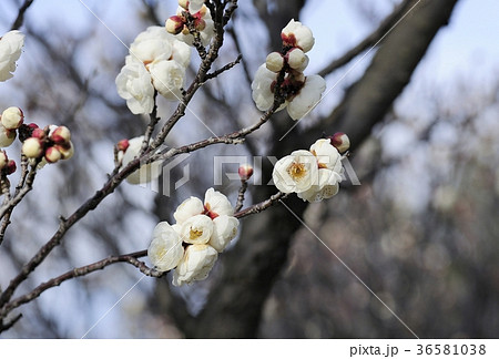 初春の梅林の中の白い梅の花 大阪府堺市の荒山公園