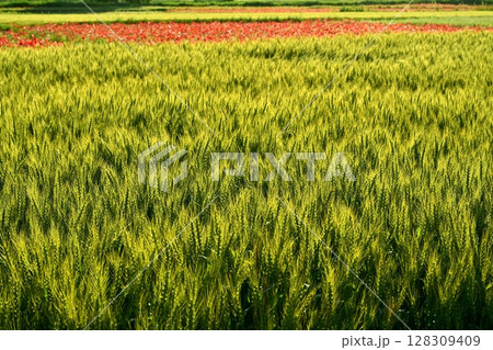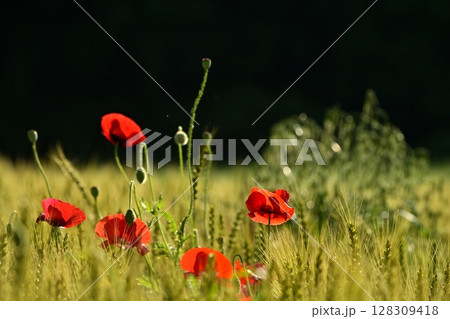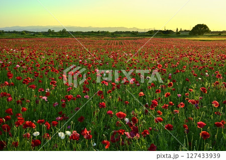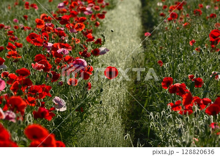 鴻巣市馬室地区の朝露付くポピーの花畑