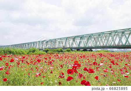 ポピー畑と鉄橋を渡る成田エクスプレス
