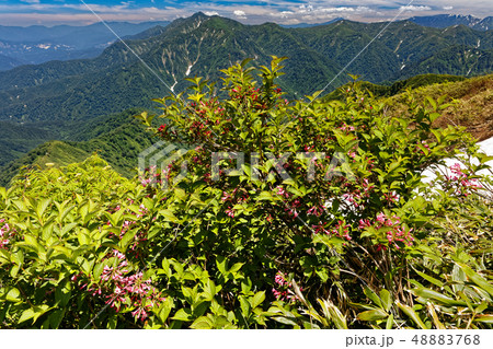 越後駒ヶ岳稜線のタニウツギの花と荒沢岳