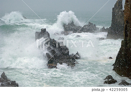 福井県坂井市 東尋坊 荒磯遊歩道 にわか吹雪