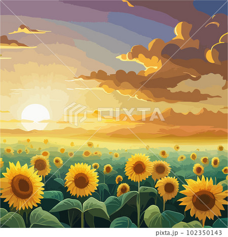 A field of tulips against the backdrop of mountains. Spring banner vector illustration. huge field of colorful tulips. Behind the field is a mountain range. Sunset. clouds of orange