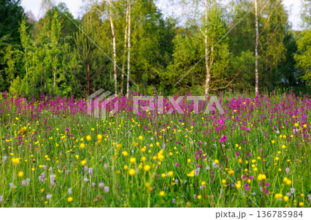 Colorful wildflowers bloom in a serene meadow under the warm sun at midday in springtime